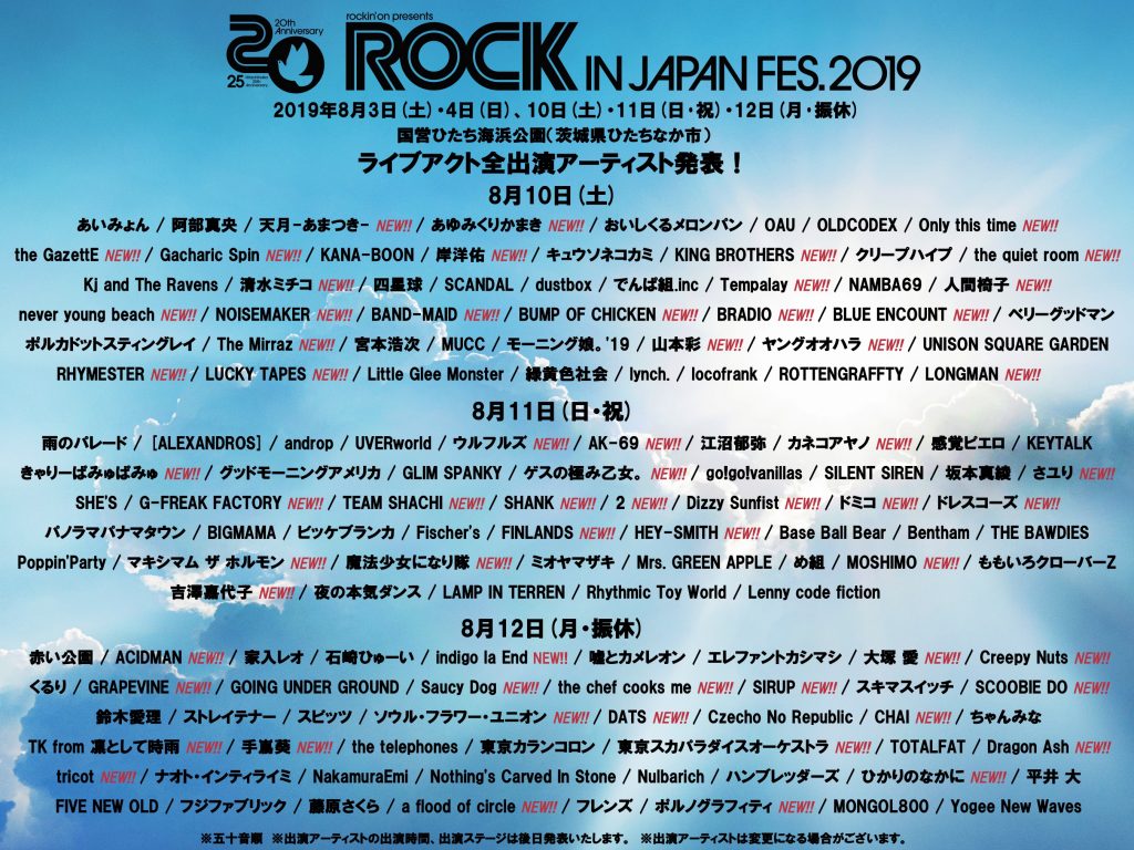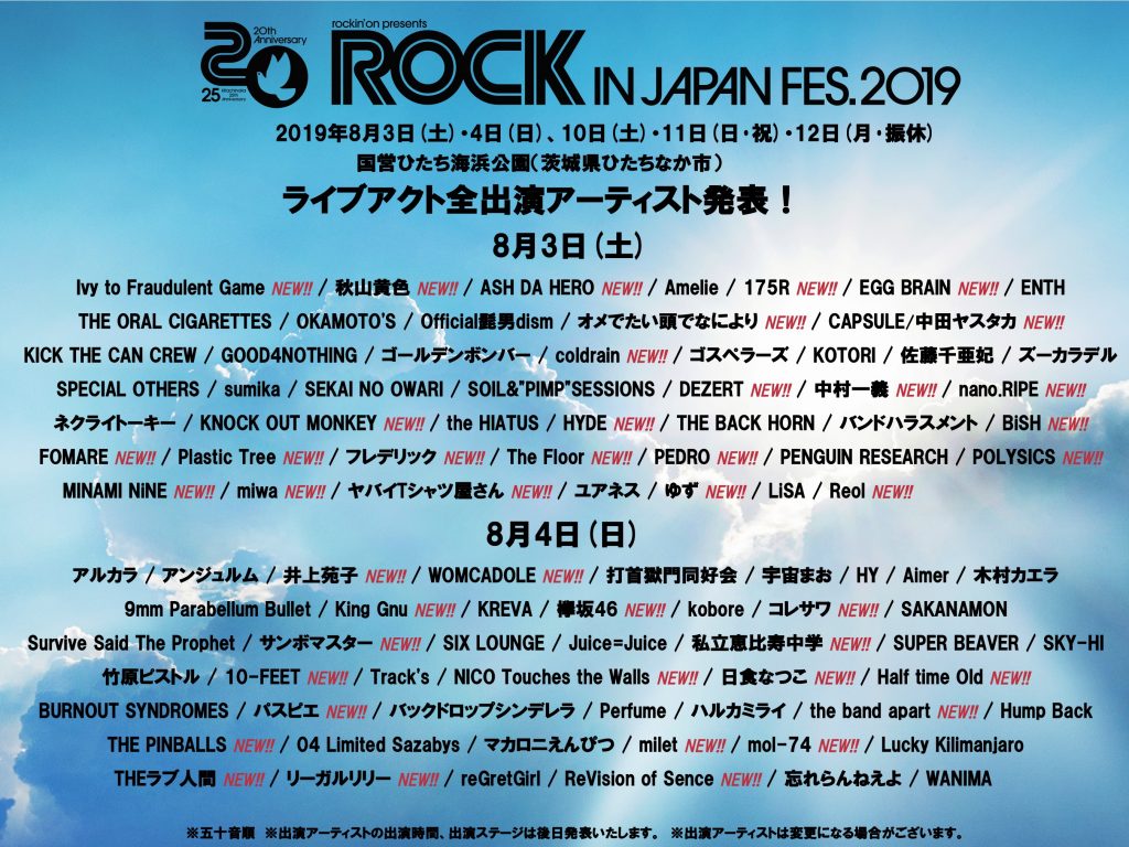 日本超大型的搖滾音樂節「ROCK IN JAPAN FESTIVAL 2019」即將在8月3日・4日、10日・11日・12日舉辦,共計5日。場地在茨城縣ひたち海濱公園。