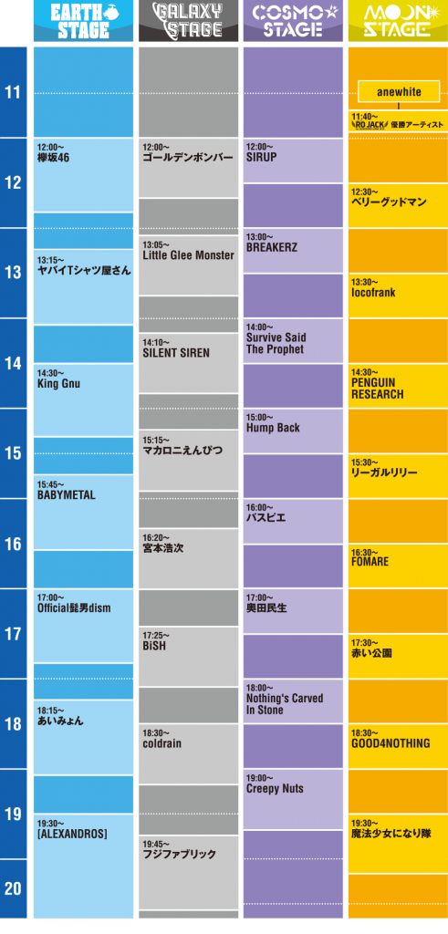 あいみょん / 赤い公園 / [ALEXANDROS] / 奥田民生 / Official髭男dism / King Gnu / GOOD4NOTHING / Creepy Nuts / 欅坂46 / ゴールデンボンバー / coldrain / SILENT SIREN / Survive Said The Prophet / SIRUP / Nothing’s Carved In Stone / パスピエ / Hump Back / BiSH / FOMARE / フジファブリック / BREAKERZ / BABYMETAL / ベリーグッドマン / PENGUIN RESEARCH / マカロニえんぴつ / 魔法少女になり隊 / 宮本浩次 / ヤバイTシャツ屋さん / リーガルリリー / Little Glee Monster / locofrank