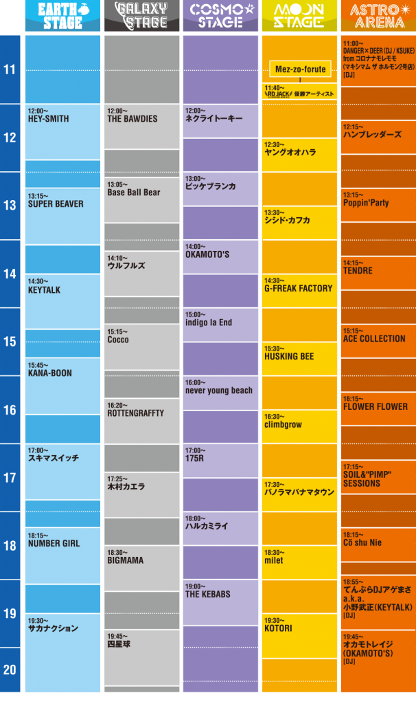 175R / indigo la End / ウルフルズ / ACE COLLECTION / OKAMOTO’S / KANA-BOON / KEYTALK / 木村カエラ / climbgrow / THE KEBABS / Co shu Nie / Cocco / KOTORI / サカナクション / G-FREAK FACTORY / シシド・カフカ / 四星球 / SUPER BEAVER / スキマスイッチ / SOIL&”PIMP”SESSIONS / TENDRE / NUMBER GIRL / ネクライトーキー / never young beach / HUSKING BEE / パノラマパナマタウン / ハルカミライ / ハンブレッダーズ / BIGMAMA / ビッケブランカ / FLOWER FLOWER / HEY-SMITH / Base Ball Bear / THE BAWDIES / Poppin’Party / milet / ヤングオオハラ / ROTTENGRAFFTY