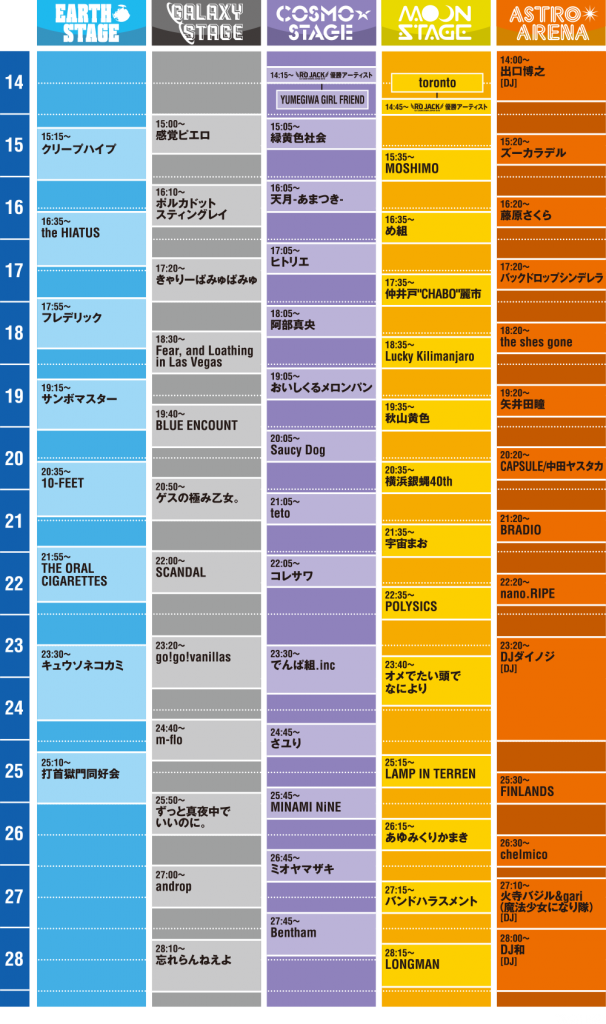 ASIAN KUNG-FU GENERATION / ACIDMAN / ASH DA HERO / amazarashi / 雨のパレード / アンジュルム / OLDCODEX / ORANGE RANGE / 9mm Parabellum Bullet / KREVA / ZAZEN BOYS / 佐野元春&THE COYOTE BAND / SHE’S / ジェニーハイ / SIX LOUNGE / Juice=Juice / 私立恵比寿中学 / 鈴木愛理 / ストレイテナー / sumika / dustbox / TOTALFAT / Nulbarich / HYDE / THE BACK HORN / ひかりのなかに / fhana / 04 Limited Sazabys / flumpool / フレンズ / マキシマム ザ ホルモン / MAN WITH A MISSION / MUCC / ユアネス / 夜の本気ダンス / reGretGirl / Reol