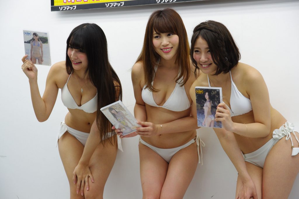写真週刊誌「FLASH2016」主催のグラビアアイドルオーディション「ミスFLASH」からグランプリ取れた川崎あや(25歳。165センチ、B83・W54・H84)、豊田瀬里奈(25歳。160センチ、B90・W61・H84)、中野杏(21歳。158センチ、B80・W60・H83)が5月14日、都内秋葉原でイメージDVD『ミスFLASH2016』発売イベントを挙行し、大勢のファンと一緒に盛り上げた。