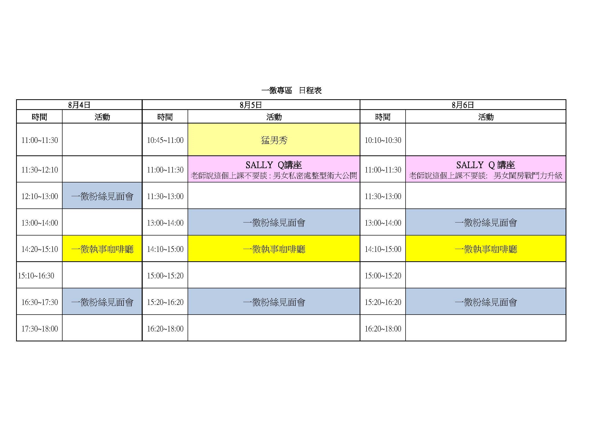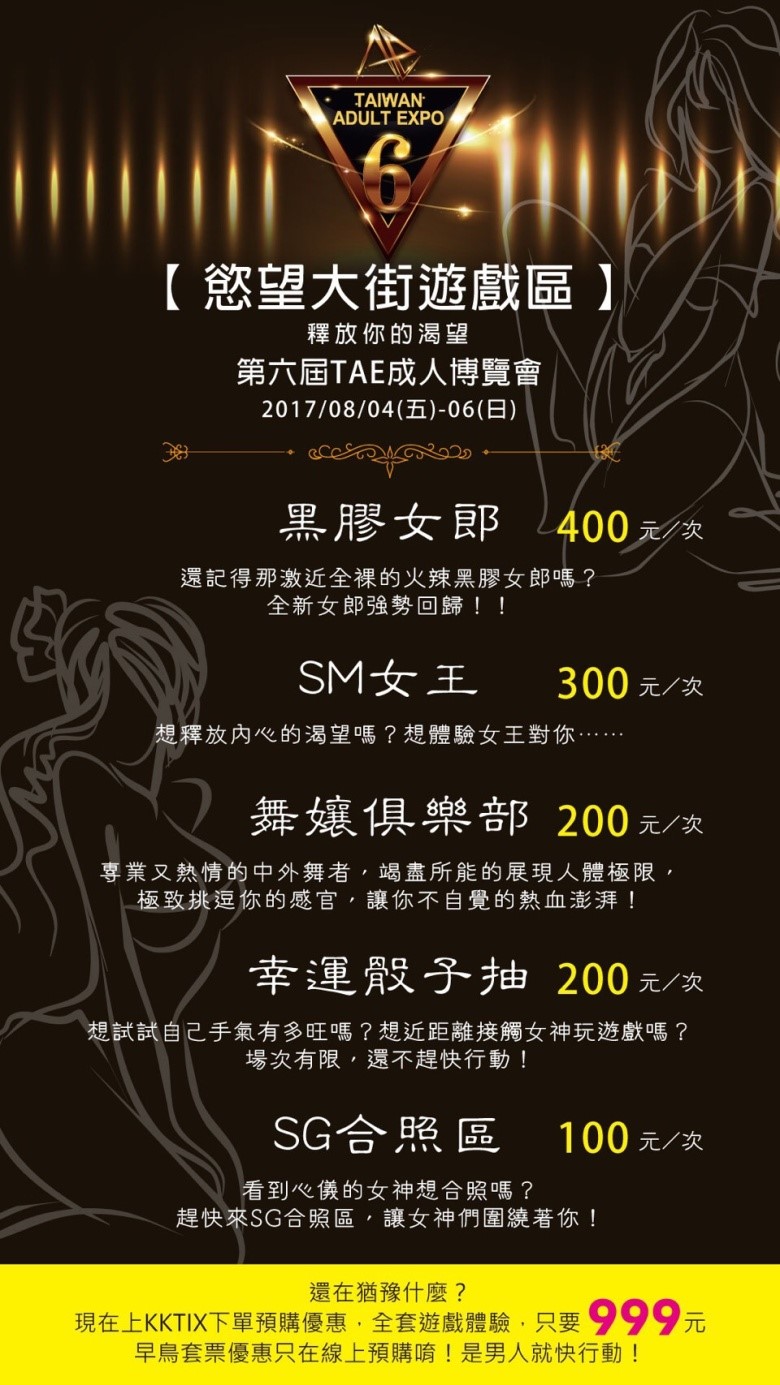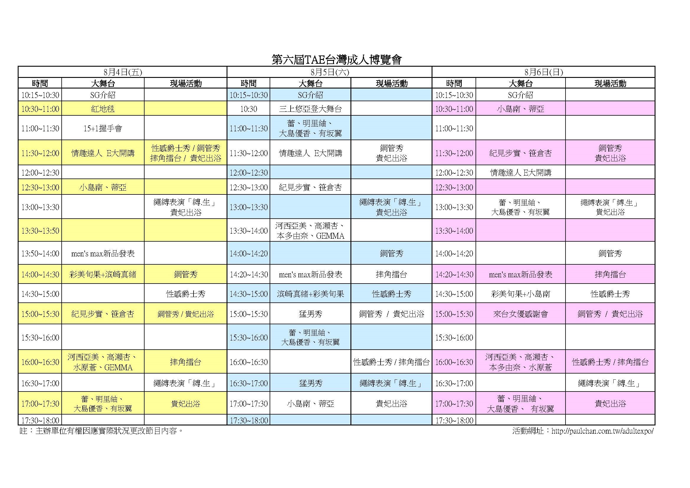 第六屆台灣成人博覽會(Taiwan Adult Expo;TAE)將在8月4日~6日於台北˙世貿三館隆重開幕。主辦單位邀請16位一線AV女優和1位男優到場,於場內舉辦攝影會和互動遊戲、午餐約會等活動。
