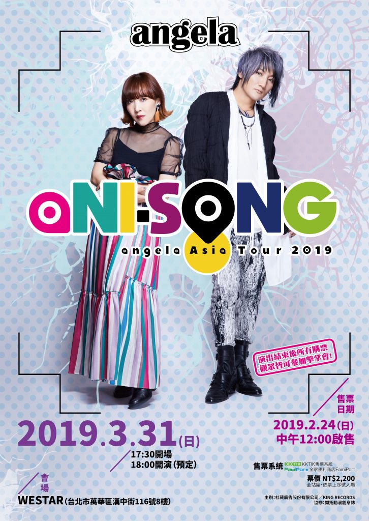 3月31日將舉行的「angela Asia Tour 2019 “aNI-SONG」台北場會是本次亞洲巡迴的首站,隨後4月28日在香港,5月2日回到日本,angela也非常期待能在他們所愛所熟悉的台北為這次的巡迴演出揭開序幕,帶著台灣粉絲的愛全力以赴進行每次的演出。台北場門票將於2月24日週日中午12點於KKTIX售票系統開賣,請喜愛angela、喜愛動畫音樂的朋友千萬不要錯過了。會後atsuko與KATSU更將與每位來場觀眾擊掌,希望能近距離接收到觀眾給他們的支持與祝福。